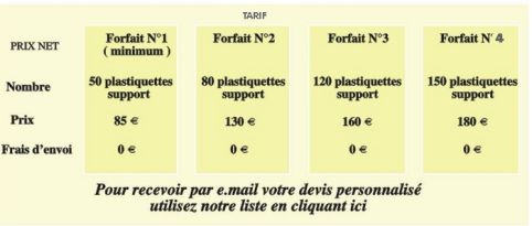 Nom du magasin noté sur chaque plastiquette<br />- Textes différents sur chacune des plastiquettes.<br />- Nom des produis notés<br />- Case réinscriptible pour noter les prix<br />  ou prix imprimés ( selon votre choix )<br /><br />Possibilité de commander les plastiquettes compètement non inscrites<br /><br />- Stylo effaçable à  alcool fourni gratuitement<br /><br />- Avec support incorporé pour viennoiseries,  gâteaux et     produits salés etc....<br />- Epaisseur 370 microns ( épaisseur similaire à une carte de crédit )<br />- Incassable <br />- Entretien facile<br />